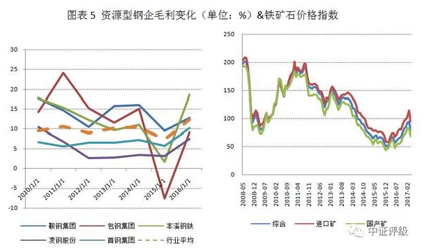 資源型鋼企的毛利率變動與鐵礦石價格的變化趨勢一致,2013年之后受全球尤其是中國鋼鐵產(chǎn)能過剩影響鐵礦石價格快速下行,資源型鋼企的毛利率進(jìn)而惡化,且惡化趨勢要顯著大于行業(yè)平均水平。2016年下半年鐵礦石價格的回暖也帶動資源型鋼企毛利的恢復(fù)。