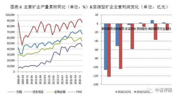 但從中長期來看,資源型鋼企歷史上的相對競爭優(yōu)勢已愈發(fā)不明顯,首先隨著國外淡水河谷、必和必拓等主流礦企2013年之前新建優(yōu)質(zhì)鐵礦的持續(xù)投產(chǎn)以及隨著國內(nèi)廢鋼累積率逐步提升對鐵礦石的替代作用不斷加強(qiáng),鐵礦石市場供求將逐漸步入買方市場,國內(nèi)鐵礦石的品味和成本劣勢將越發(fā)明顯,資源型鋼企長期依賴的競爭優(yōu)勢或轉(zhuǎn)化為劣勢。從鐵礦石價格的變化趨勢可以看出,鐵礦石價格在2016年下半年持續(xù)回升,但已難以恢復(fù)到前期平均水平。本輪鋼鐵行業(yè)周期性回暖背景下,資源型鋼企盈利狀況的恢復(fù)明顯弱于行業(yè)平均。